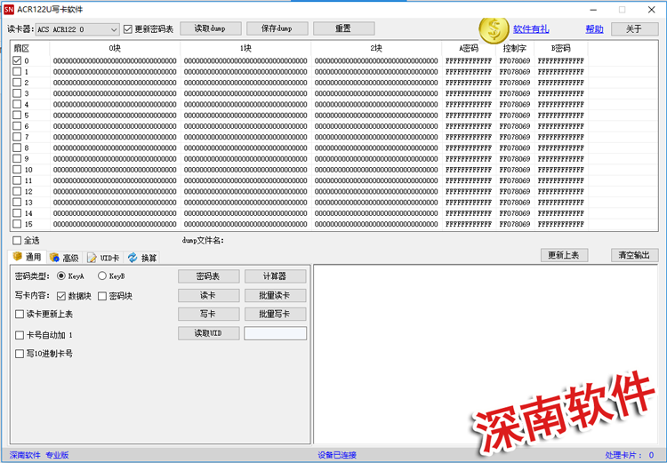 原IC卡批量加密软件,是一款适用于 ACR122U读写器的IC卡专业读写软件。可以读取dump文件,可以批量加密卡片,批量写卡,也可以批量写卡并加密,批量写卡时,还可以设置卡号自动加 1 ,功能强大,卡厂必备软件。